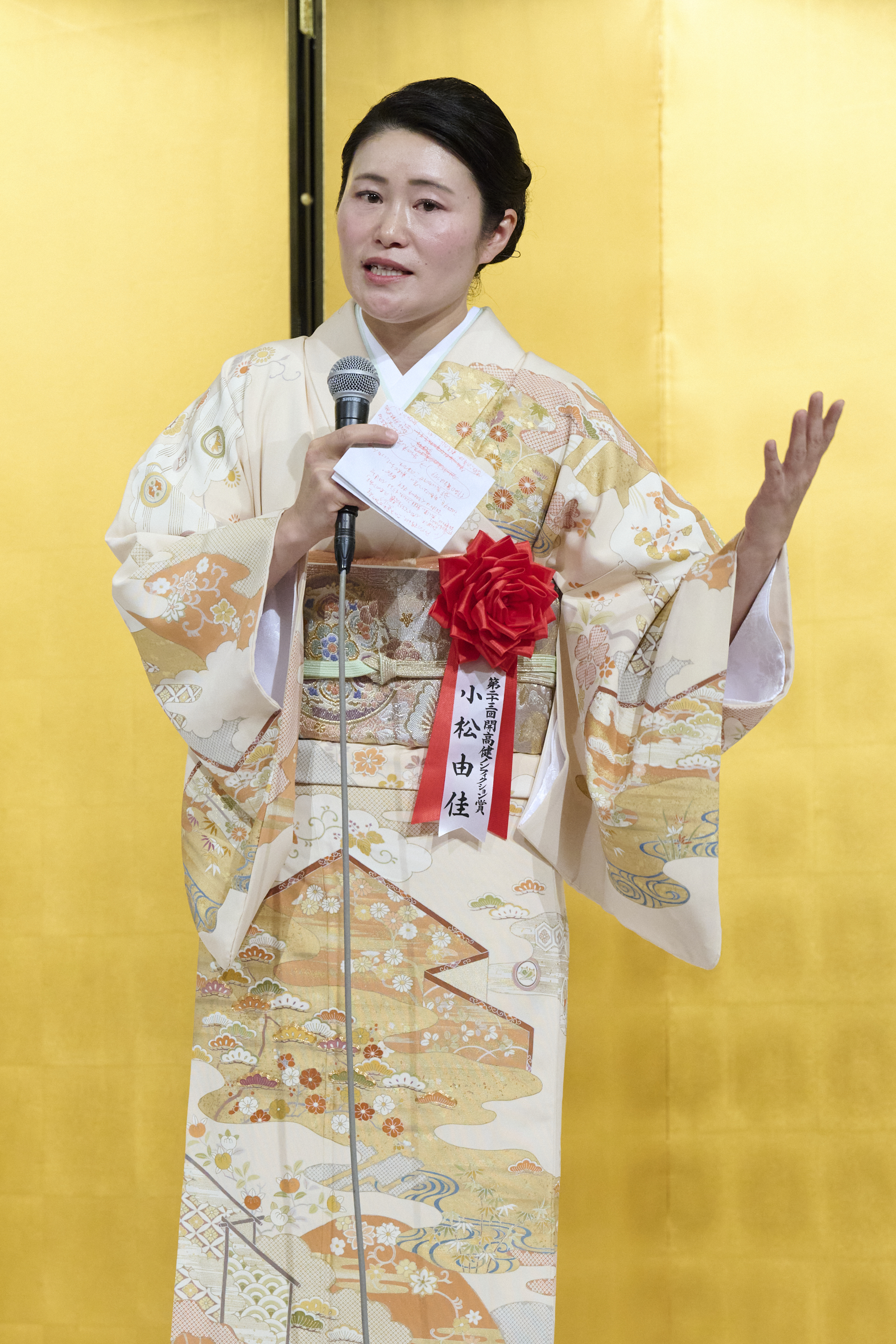 華やかな晴れ着で登壇なさった小松由佳さんは、二人のご子息が最前列に座って式典に参加していることに触れ、「シリアを子連れで取材してきて、様々な困難な日々があった中で今日という日を迎えることができて、大変感慨深いものがある」と噛み締められました。